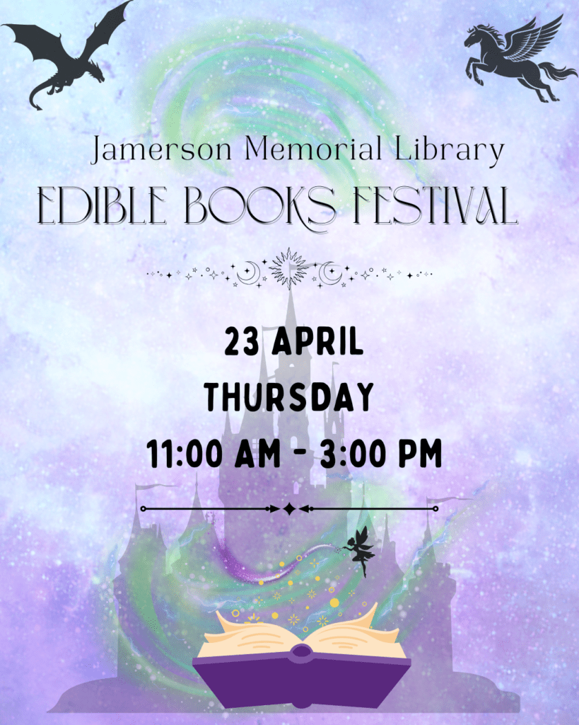 April 23rd, Thursday – Jamerson Library’s Edible Book Festival from 11:00 am to 3:00 pm on the main floor. Join in celebrating books, art, and culture with this creative contest where participants submit edible art projects made to resemble books, or inspired by a story or book title. Rules and entry forms are on the information table, and registration forms are at the circulation desk.