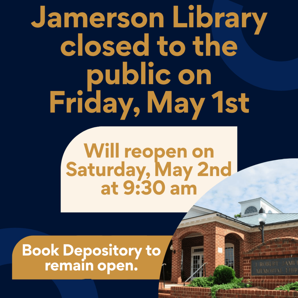 The Library will be closed to the public on Friday, May 1st, for a professional development day. We are sorry for any inconvenience this may cause our patrons. We will reopen on Saturday, May 2nd, starting at 9:30 am. The book depository, located at the back of the building, will remain open.
