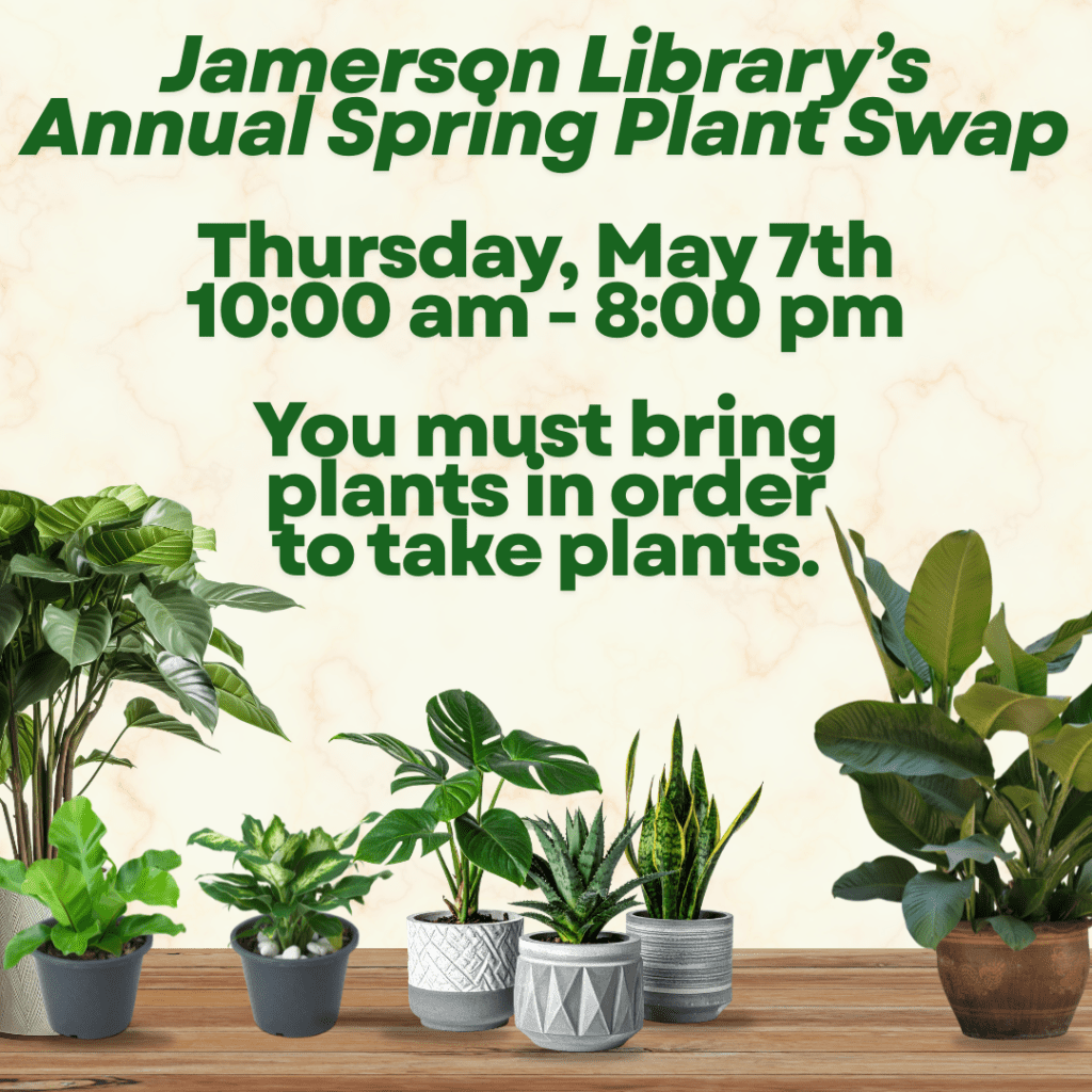 May 7, Thursday – Jamerson Memorial Library’s Spring Plant Swap! (10 am – 8 pm)